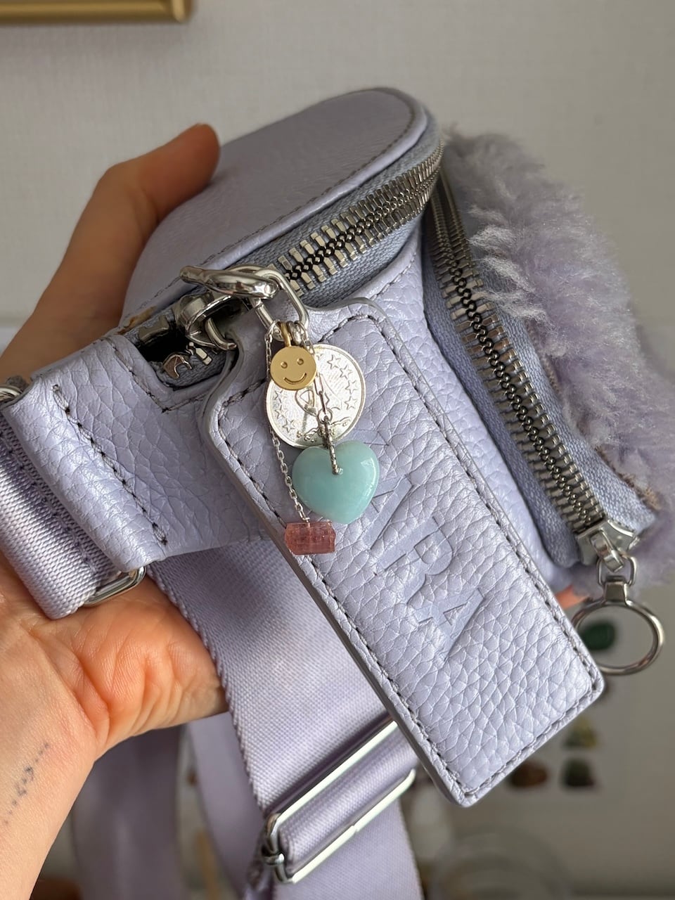 ツーソンで出会ったハートのラリマーとピンクトルマリン原石、アフガニスタンのヴィンテージコイン、スマイルチャームをミックスしたラッキーチャーム。