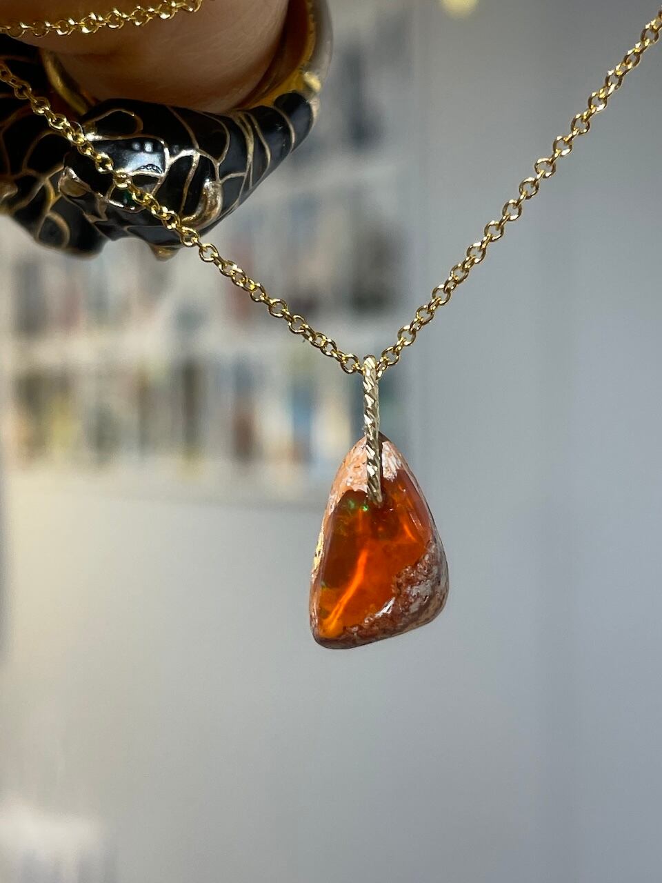 鮮やかなオレンジのオパールに、更に鮮やかなネオングリーンが輝く一粒。小さなトライアングルから、燃え上がる情熱とエネルギーが溢れ出すような魅惑的な一粒です。