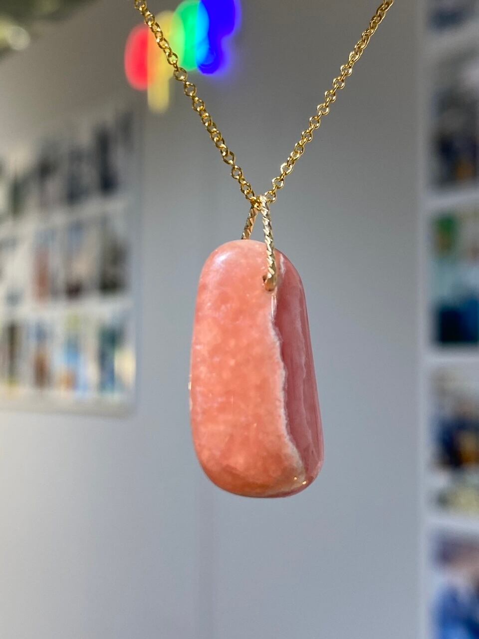 寒い季節に、気持ちをホットにしてくれるような鮮やかなピンクのロードクロサイトのチャーム♡クリスマスベルのようなキュートなフォルムで、冬の装いを華やかに彩ってくれそう。波打つように縦に入ったラインの模様が、ロードクロサイトのメッセージである愛情の豊かさを表現しているかのよう。