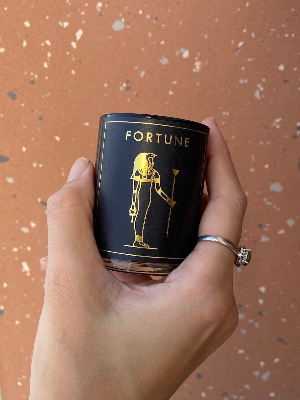 フォーチュンをテーマにブレンドされたエッセンシャルオイルのキャンドルは甘く神秘的な香り。古代エジブトの幸運の神、レネネトがハッピーなパワーを与えてくれそう。