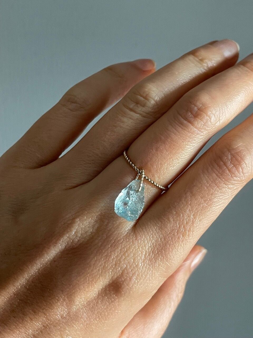 初登場のアクアマリンのリング。クリアで淡いブルーが印象的なこのアクアマリンは、まるで静かな海の波が光を反射しているかのような美しい輝きを放ちます。自然そのままの不規則なフォルムが、唯一無二の存在感を演出し、ゆらゆらと揺れながら、どの角度から見ても異なる表情を楽しむことができます。